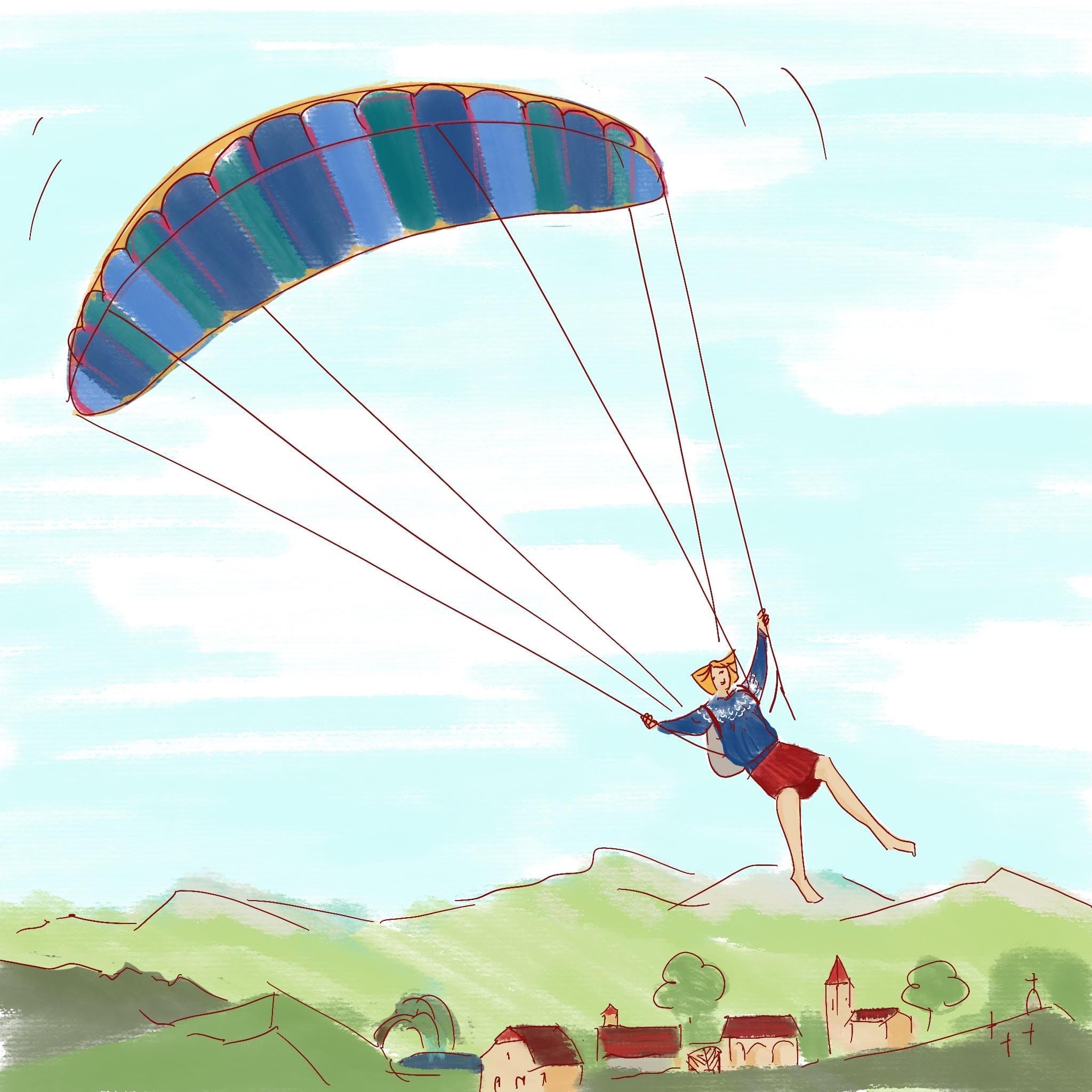 Nechala jsem si to nakreslit. Sebe jak se vznáším nad krajinou. V té kresbě měl být nadhled nad padákem z banky i nový směr. Výraz toho, že přistanu v okrajových lokalitách. Že mě cesta zavede do Sudet. Směr Maříž.